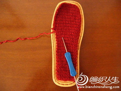 2、用短针钩鞋底面,大小比鞋底小一圈。钩好后再周围钩一圈短针,针数由鞋底上线决定。