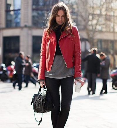 鲜艳的红色皮衣绝对耀眼瞩目!还有一股娇媚的女人味。下身的牛仔裤有水洗做旧效果,搭配机车短靴更加强调酷帅感,型格满分!