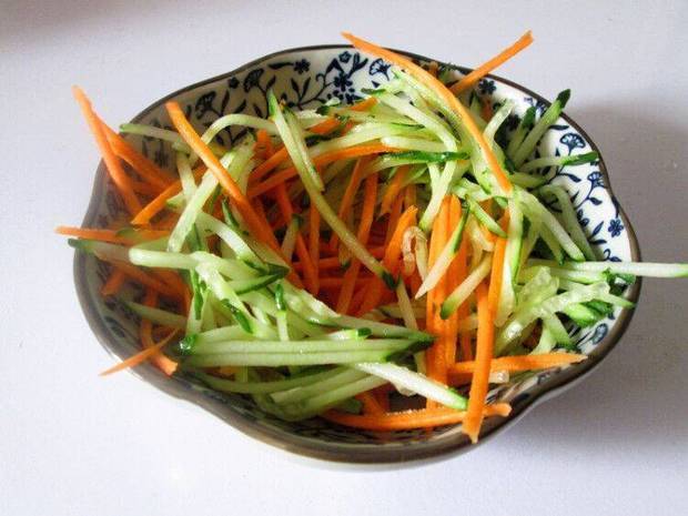 2、黄瓜、胡萝卜洗净,切成丝,放入碗中。