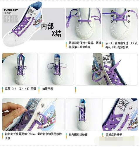 通常都是交叉穿法,鞋带二端先穿离鞋头的第一对鞋眼孔,同时穿下,然后二端交叠穿鞋眼孔,最后穿完后二端都是一样长度,打成蝴蝶结即可