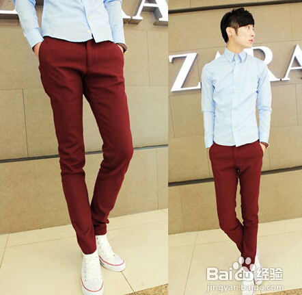 男生的酒红色小脚裤,搭一件看似中规中矩的蓝色衬衫,顿时就让整个人充满了雅痞的气质,鞋子的搭配在这里也很重要,可以选浅色系的波鞋跟衬衣呼应。