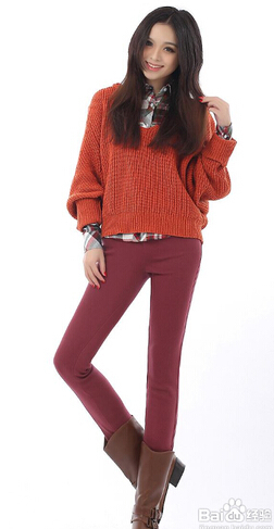 酒红色的铅笔裤,搭一件两件套同色系的毛衣,很青春,很有活力呢,靴子可以选择颜色略深的棕色,这样就不会显的头重脚轻了。