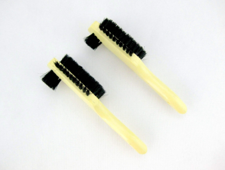 2.用翻毛皮鞋的专用刷刷。注意铜丝面主要处理污渍较重的部位和被磨光的部位