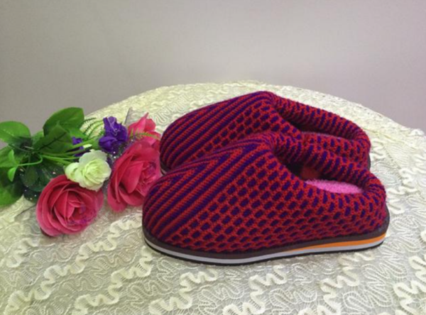 第一步 首先将买到的拖鞋底,用彩色别针分别在两只鞋的前后,做上鞋头、鞋尾的记号,避免钩织时不对称。下一步 我们在鞋头一侧记号旁边,开始将毛线穿在鞋底的针脚上,开始起针,沿鞋底周边的针脚钩织一圈短针。