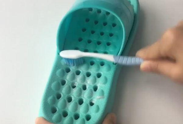 将牙膏涂于拖鞋表面,再滴上一滴花露水,用牙刷轻轻刷动,刷干净后再用纸巾擦拭,就可以去除拖鞋上的污垢和异味了。