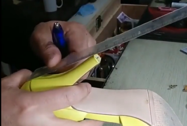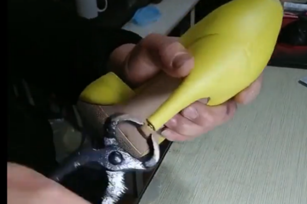 3、接下来将鞋跟需要修剪掉的部分用砂轮机打磨掉即可,如图所示。