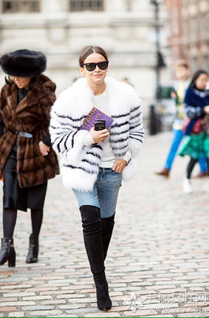 小编点评:毛绒外套是女生冬季选择较多的单品,而除了尖头高跟鞋能表现其优雅格调外,长靴也是选择之一,而且是冬季非常好的保暖担当哦!
