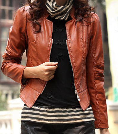 浅棕色小皮衣很有细节美感,搭配格子长衫,可爱又不甜腻