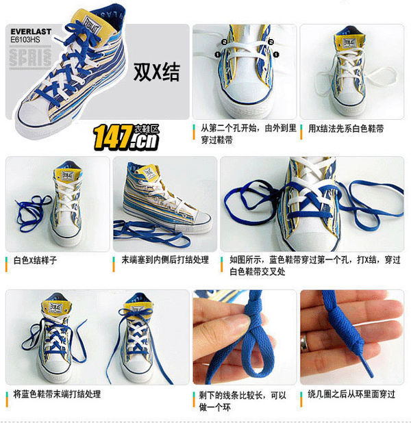 现在是穿蓝色鞋带,从第一个孔开始打X结,穿过白色X结交叉处。