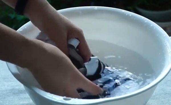 1、首先我们把皮革面运动鞋放在水中弄湿;